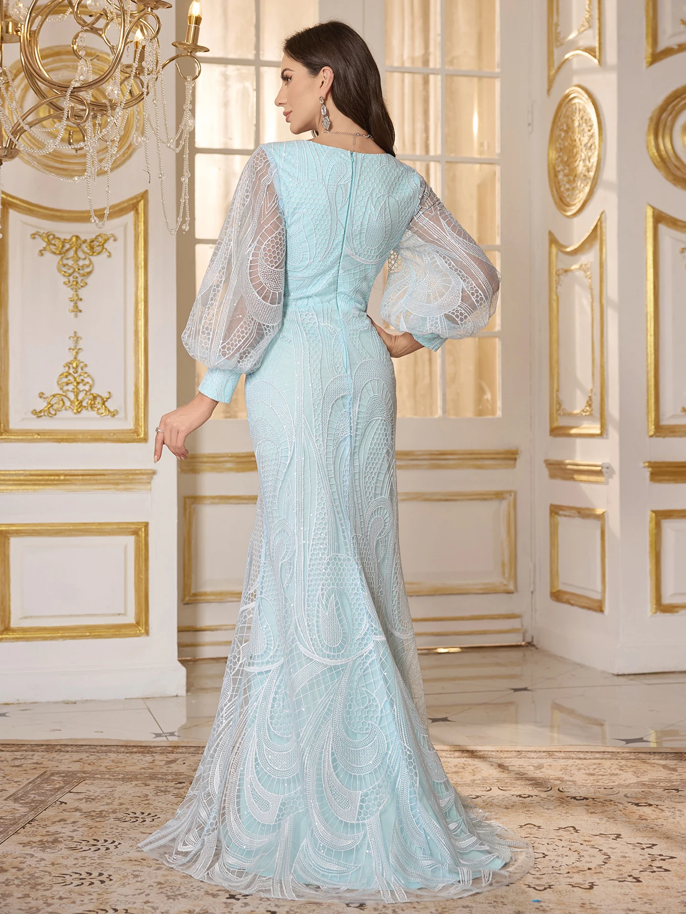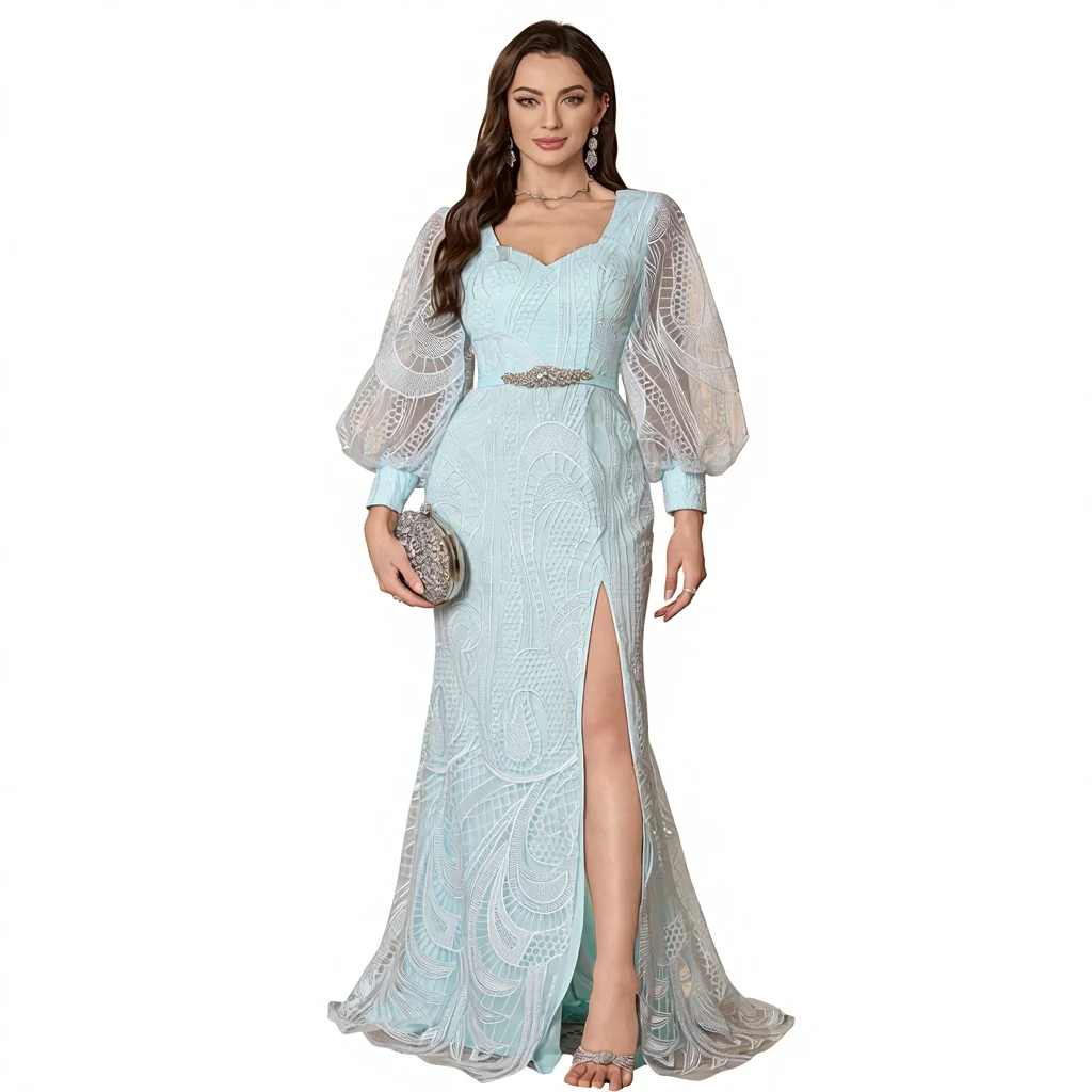 Solid Sweetheart Collar Lantern Sleeve Lace Embroidery Fabric Handmade Rhinestone Decor Split Hem Elegant Evening Party Dress